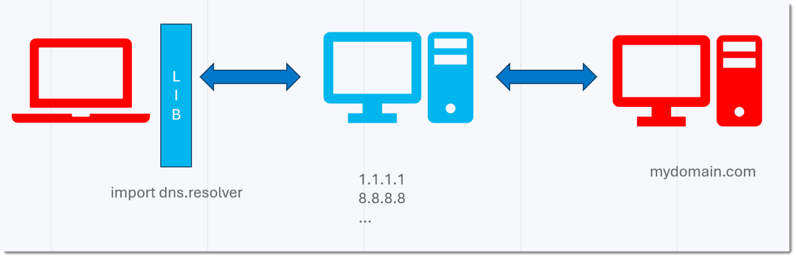My queries look like this: bytes.41.A.mydomain.com. In this example, 41 is the hexadecimal value of the byte value I’m transmitting, and A is the ASCII representation of the byte value I’m transmitting. On the other end, I have my dnsresolver.py software running with a custom function, that checks the incoming request to see if the hexadecimal value still corresponds to the ASCII value. It logs the result in a log file, and replies with 127.0.0.1 if it matches, and with NXDOMAIN if it doesn’t.
