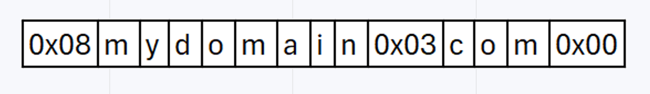 0x08 is the length of label mydomain, 0x03 is the length of label com, and 0x00 is the length of the root label (the . at the end of mydomain.com.).