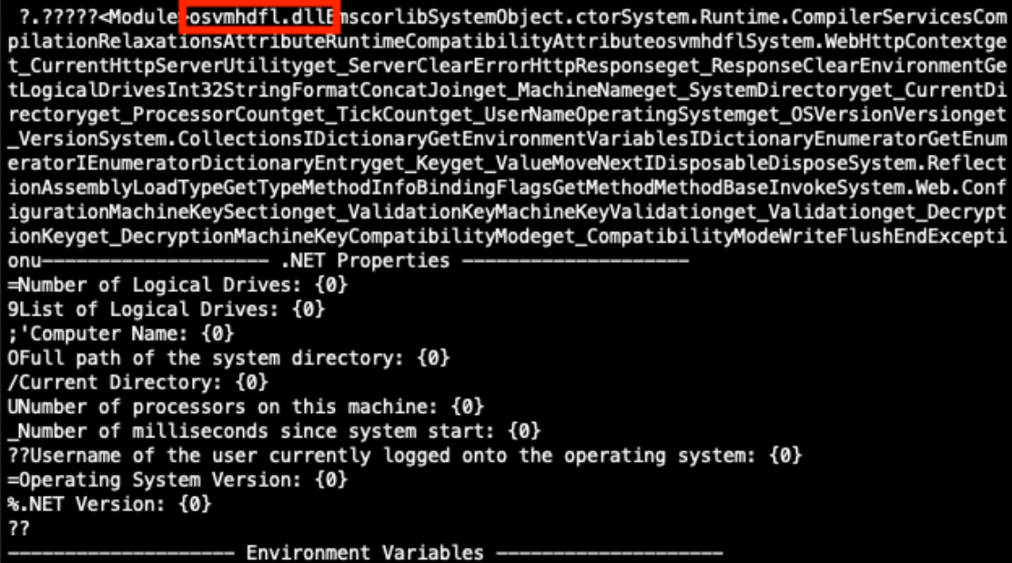 Once our payload is decoded, we see that it contains a known malicious .NET Dynamiclink Library (DLL) binary named osvmhdfl.dll. If this in-memory payload was executed successfully on a vulnerable SharePoint server, it could extract machine keys and other system information and return the information in the HTTP response [9].