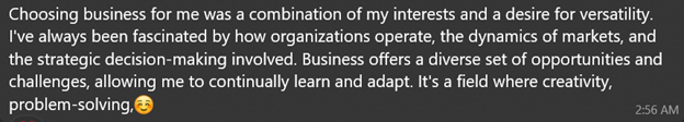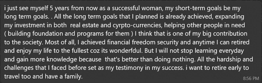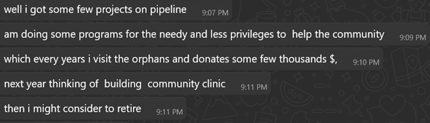 Both claim the same job ? Business Analyst ? which later supports credibility when discussing investments. Claiming to be foreigners explains grammatical errors and factual mistakes about the UK. Notably, job descriptions are long and well-written, lacking earlier quirks ? suggesting prewritten, copy-pasted content. This points to a playbook: flatter the target, establish credibility with occupation and location cover, then use scripted replies where legitimacy matters.