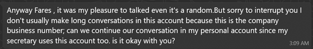 The excuse is plausible and low-friction. Once texting the new number, writing style often changes ? a strong sign of a hand-off to a different operator or team focused on long-term grooming.