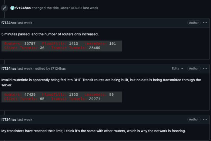On February 3, I2P users began complaining on the organization’s GitHub page about tens of thousands of routers suddenly overwhelming the network, preventing existing users from communicating with legitimate nodes. Users reported a rapidly increasing number of new routers joining the network that were unable to transmit data, and that the mass influx of new systems had overwhelmed the network to the point where users could no longer connect.