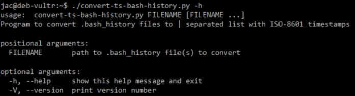 One of the ways I have used it is by piping the output through sort, in particular | sort -t '|' -k 2 to take a bunch of bash history files and sort them in time order. I’ve gone back and forth on whether or not to swap the first 2 columns, but since I encounter so many more history files without timestamps than with, having the path to the particular file that contains the command first has been quite useful. I might also add a switch to leave the file path off. I welcome comments/thoughts from others out there who might use it. There is a reason that this is v0.9, not yet v1.0.