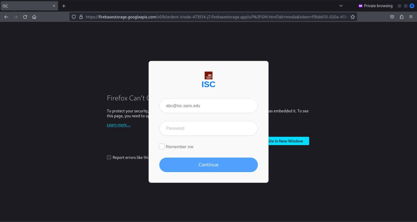 The interesting part still wasn’t apparent when I first opened the page, since, as you can see, it appeared to be a fairly typical credential harvesting page that tried to overlay a fake login prompt over a legitimate page loaded (unsuccessfully, in the case of isc.sans.edu, due to our Content Security Policy and X-Frame-Options settings) from a domain extracted from a personalized link sent to the recipient of the original phishing message…