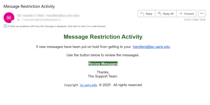 From time to time, it can be instructive to look at generic phishing messages that are delivered to one’s inbox or that are caught by basic spam filters. Although one usually doesn’t find much of interest, sometimes these little excursions into what should be a run-of-the-mill collection of basic, commonly used phishing techniques can lead one to find something new and unusual. This was the case with one of the messages delivered to our handler inbox yesterday…