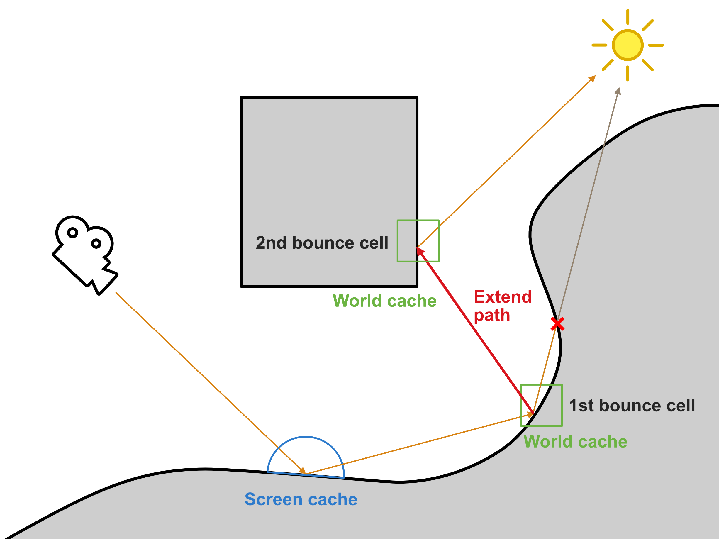 • Two separate Monte Carlo estimators are accumulated for each 1st bounce cell in order to keep track of the samples of direct and indirect light, respectively: