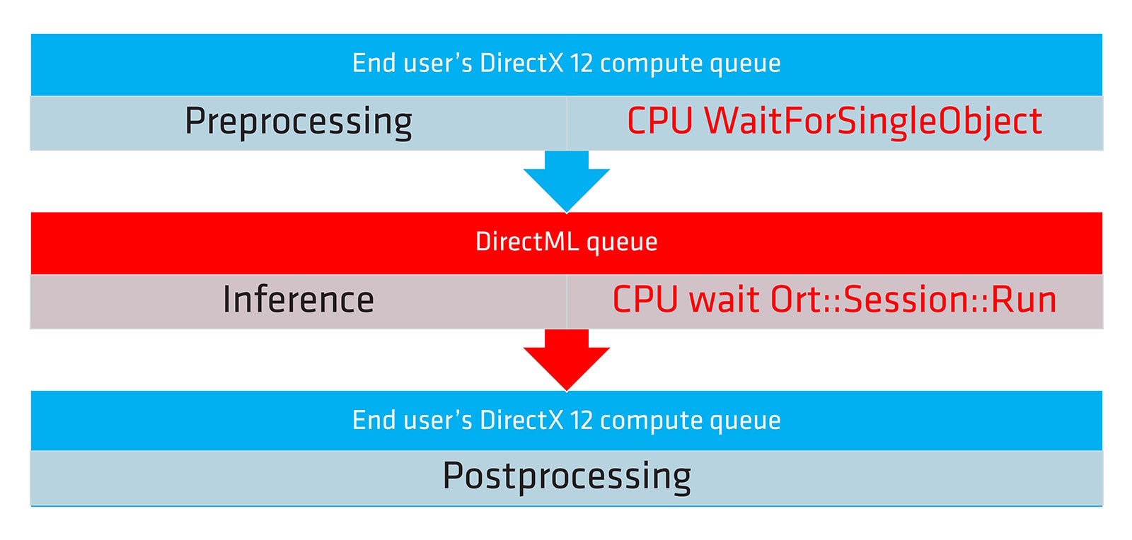 As DirectML doesn’t expose the DirectX 12 command list used by the command queue, it’s hard to use GPU synchronization between preprocessing and inference.